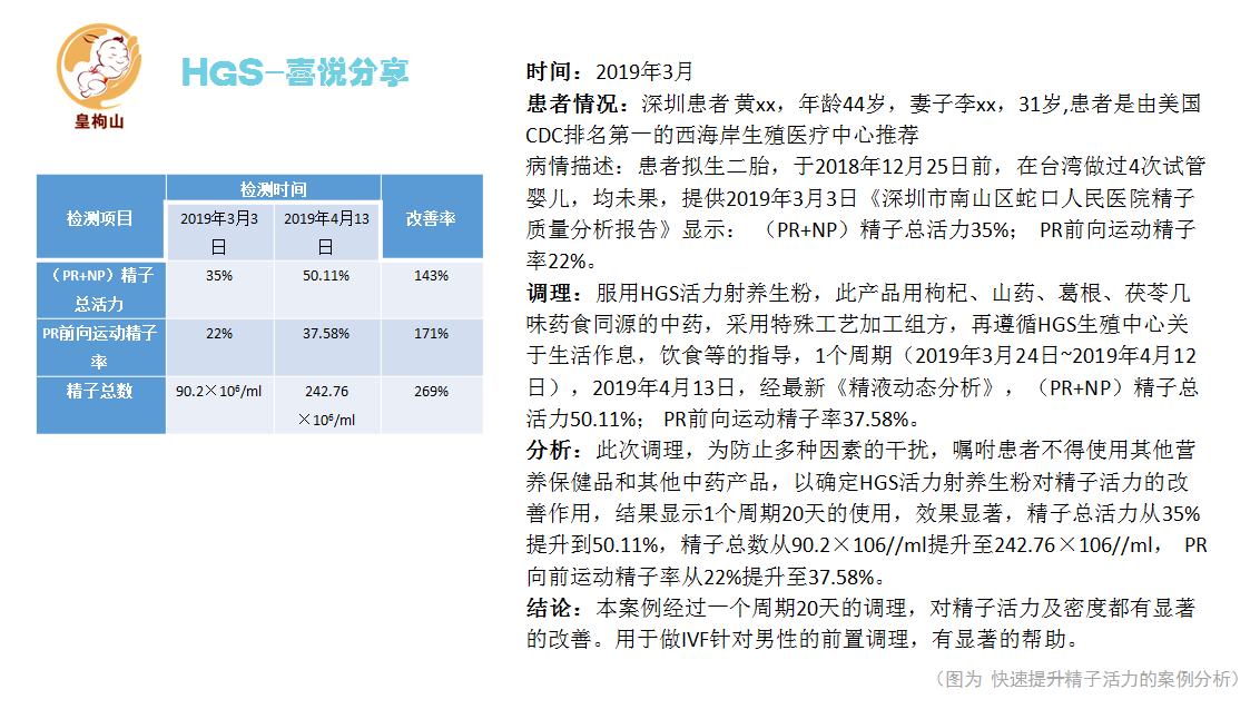 病情描述:患者拟生二胎,于2018年12月25日前,在台湾做过4次试管婴儿,均未果,提供2019年3月3日《深圳市南山区蛇口人民医院精子质量分析报告》显示: (PR+NP)精子总活力35%; PR前向运动精子率22%。