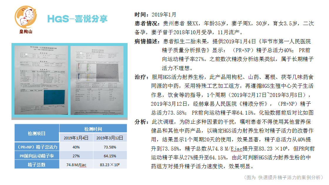 贵州患者 裴XX,年龄35岁,妻子周X,30岁,育女3.5岁,二次备孕,妻子曾于2018年10月受孕,11月流产。病情描述:患者拟生二胎未果,提供2019年1月4日《毕节市第一人民医院精子质量分析报告》显示: (PR+NP)精子总活力40%; PR前向运动精子率27%。之前数次精液分析结果类似,属于长期精子活力不理想。